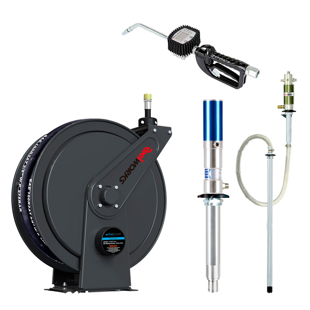 Komplet oliesæt med slangeopruller, digital oliepistol og pumpe 3:1